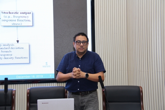 2019年12月19日上午,受土木工程学院邀请,英国斯旺西大学(Swansea University)工学院Sondipon Adhikari教授莅临工科二号楼B302学术报告中心,为我校土木工程学院师生做了题为“Uncertainty quantification in structural dynamics: Projection methods(结构动力学中的不确定性量化:投影法)”的学术报告。报告会由土木工程学院副院长蒋友宝教授主持,马亚飞副教授、袁明副教授、张振浩副教授、戴理朝博士以及100余名研究生参加了此次交流会。